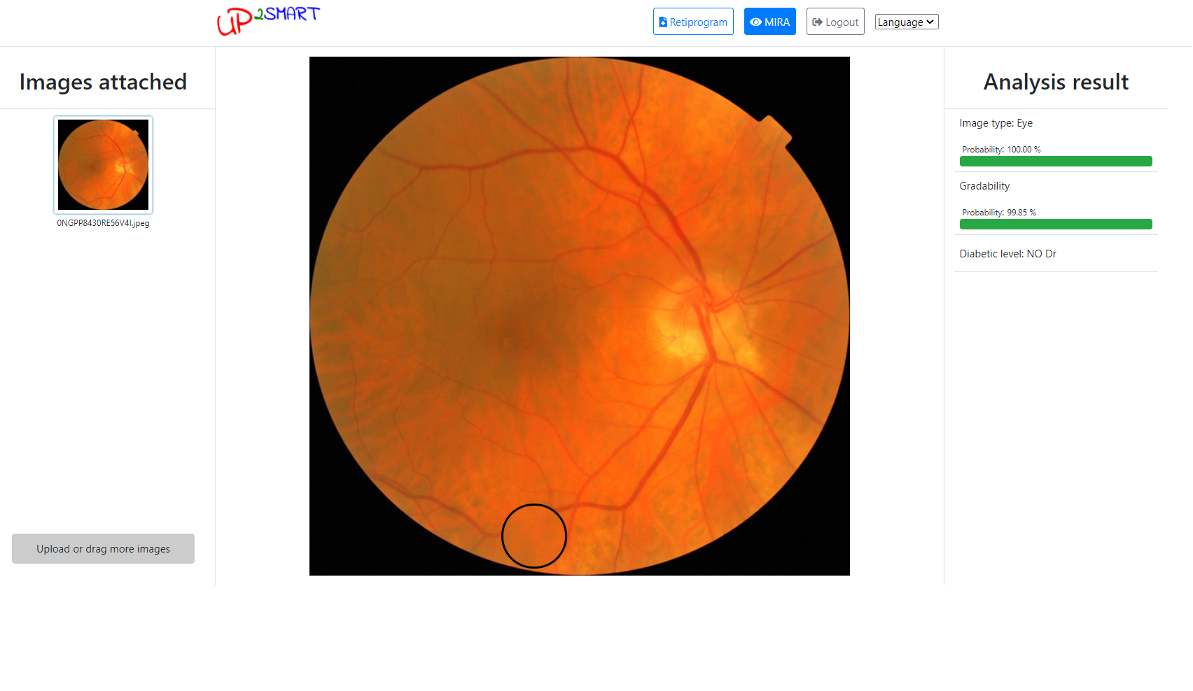 UP2SMART developed a platform for early detection and diagnosis of DR by combining artificial intelligence (AI) models. The platform includes two AI-based systems: MIRA and RETIPROGRAM.